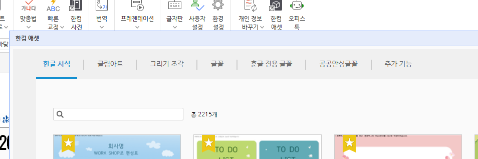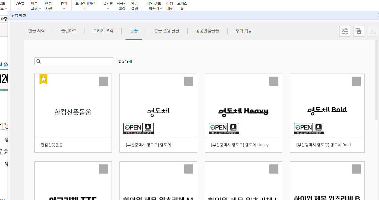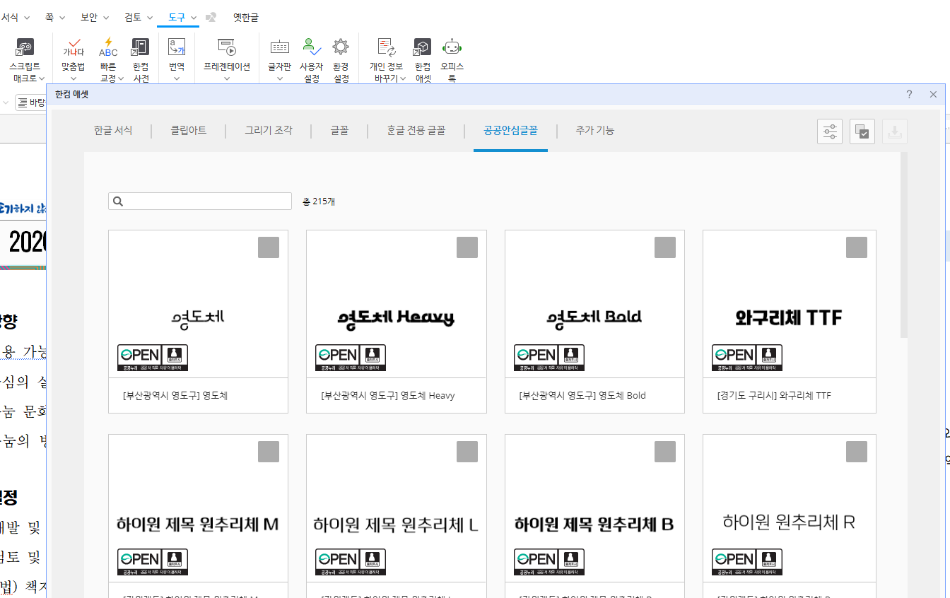 한컴에셋에서 글꼴, 한글전용글꼴, 공공안심글꼴에서 원하는 글꼴 내려받아 설치