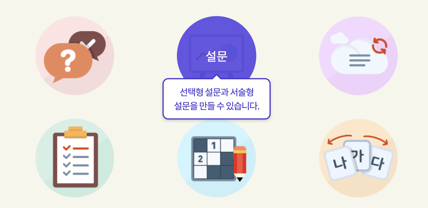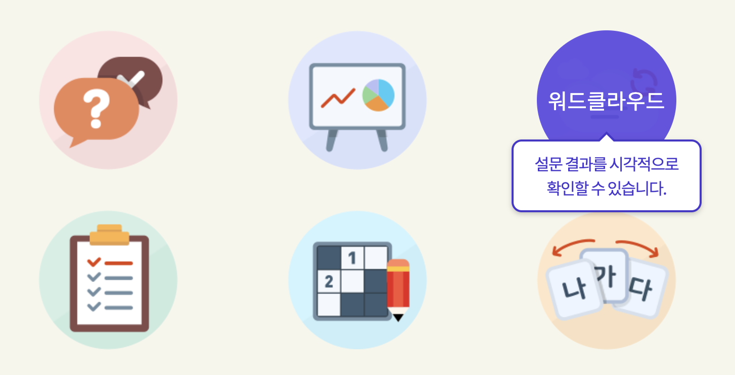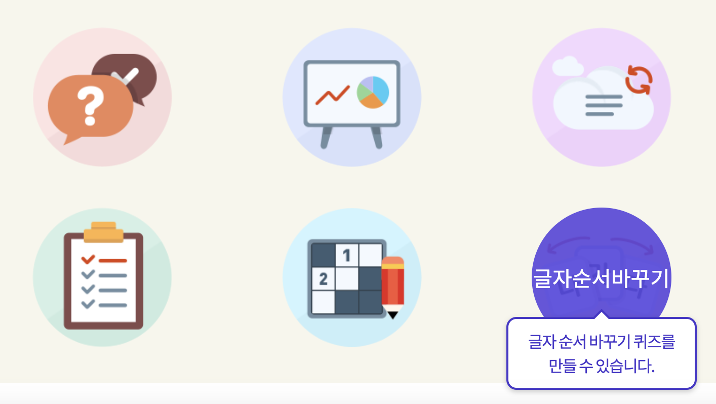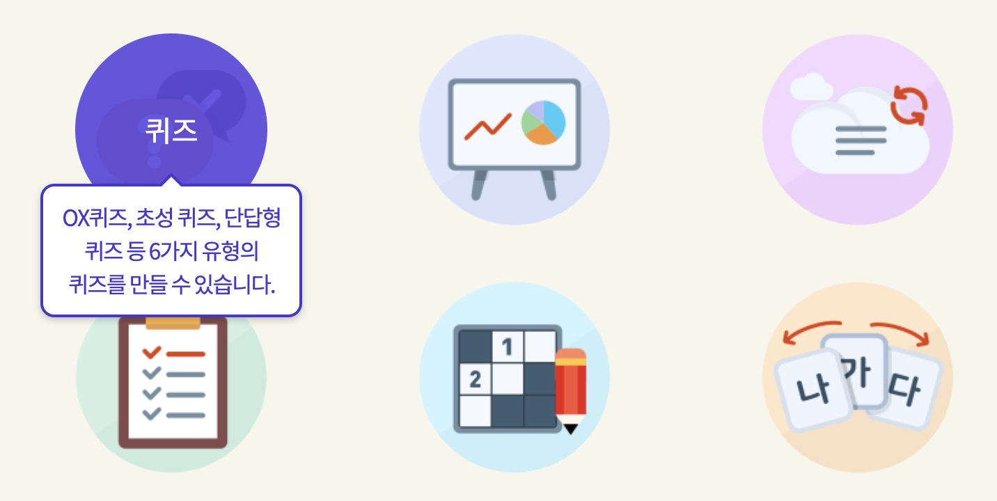 OX퀴즈,초성퀴즈, 단답형퀴즈 등 / 설문 / 워드클라우드 / i활동지 / 가로세로퍼즐 / 글자순서바꾸기