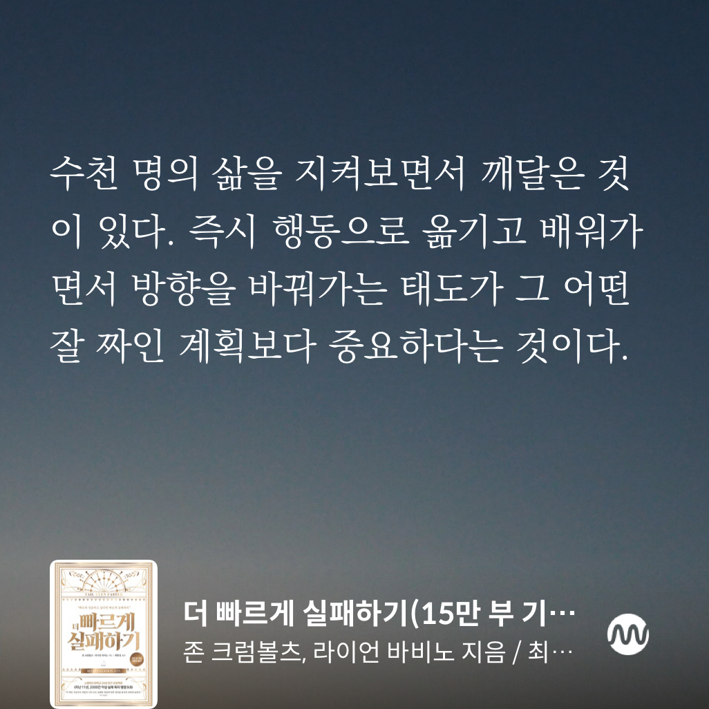 『더 빠르게 실패하기 Fail Even Faster』는 존 크럼볼츠(John Krumboltz)와 라이언 바비노(Ryan Babineaux)가 공동 저술한 자기계발서로, 빠른 시도와 실패를 촉구하는 책이다. 완벽함을 추구하기보다, 즉각 실행 가능한 ‘작은 행동 중심’을 다룬다. 〈뉴욕타임스〉는 ‘실패를 부정적으로 보지 않게 된다’는 점을 꼬집어 ‘200페이지 분량의 비타민 B-12 주사와 같다’라고 평가했다. 실제로 본문 여러 곳에서 큰 목표 설정이