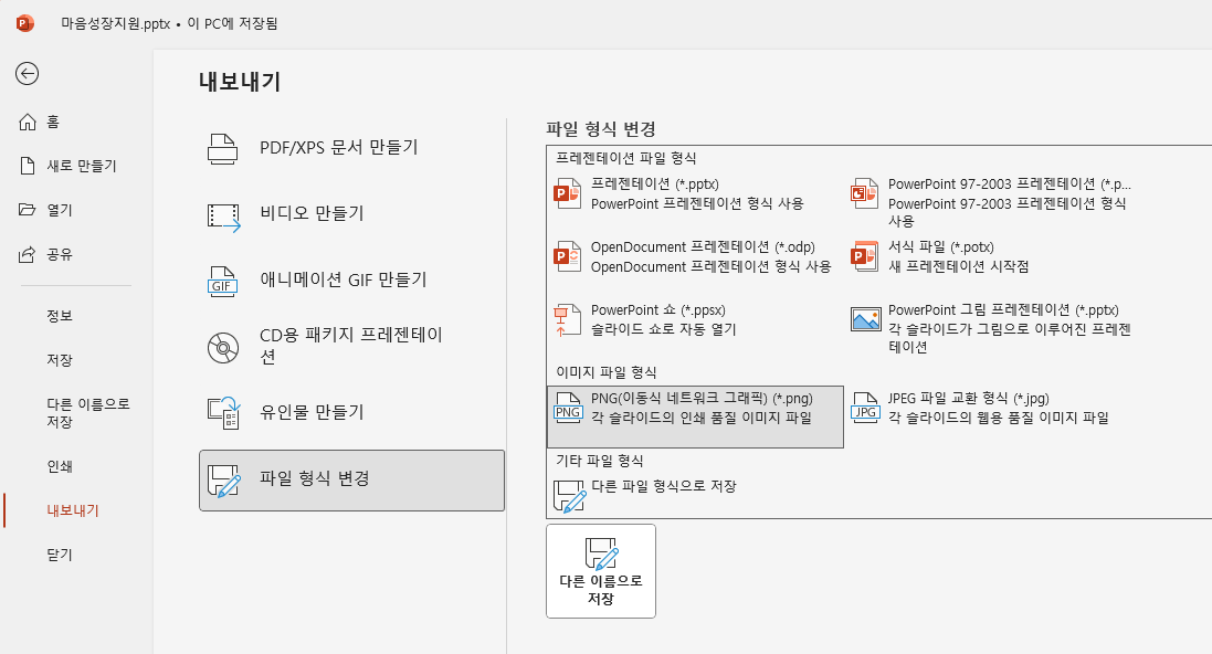 PPT 내보내기에서 [파일 형식 변경]-[이미지 파일 형식]-[PNG]를 선택한 후 다른 이름으로 저장한다.