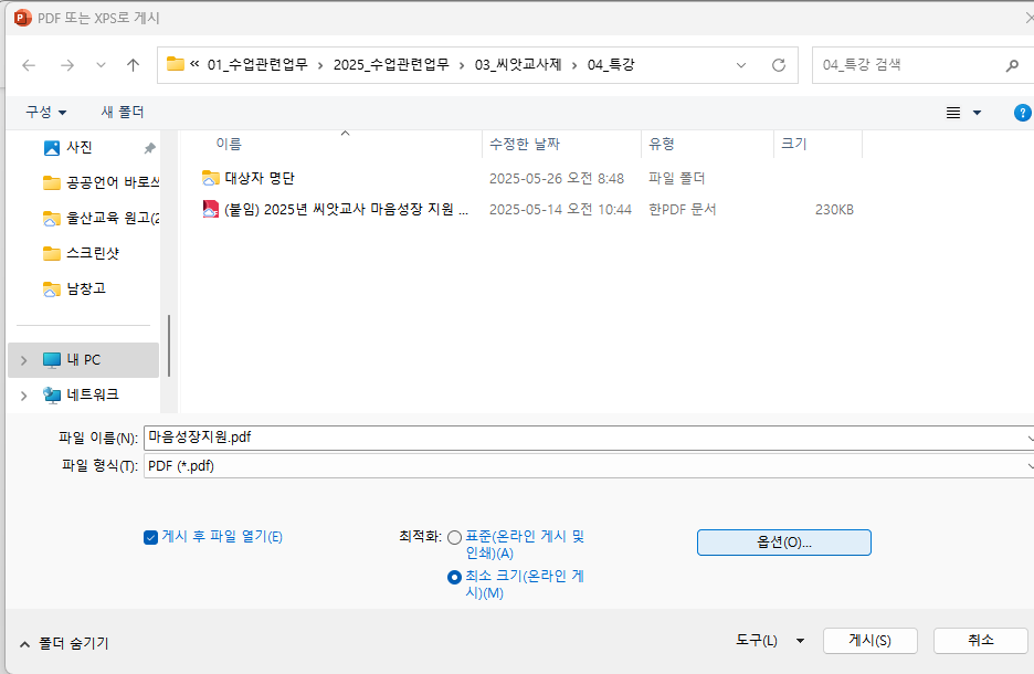 게시를 누르기 전에 최적화에서 최소 크기(온라인 게시)를 선택해서 게시를 누르면 용량이 적은 PDF로 저장이 된다.
