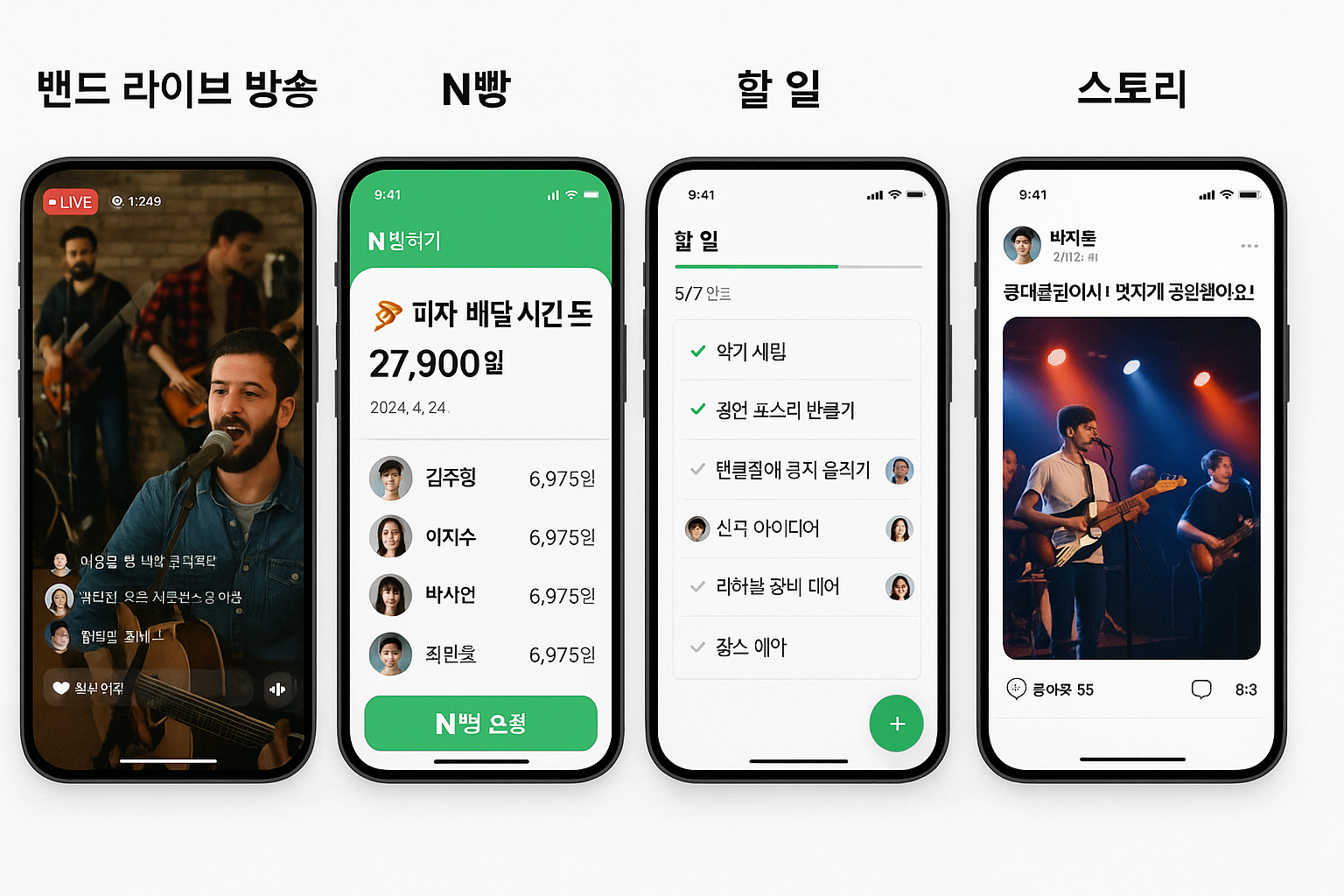 | 부가 기능 | 미션, 채팅, 사진, 투표 등 일부 | 투표, N빵, 라이브, 쇼핑 등 풍부 |