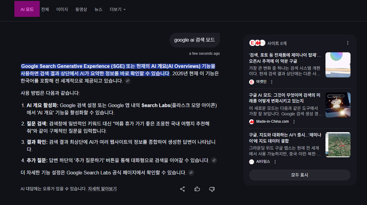더 자세한 정보는 구글의 공식 AI 모드 도움말 또는 AI 개요 안내 페이지에서 확인할 수 있습니다.