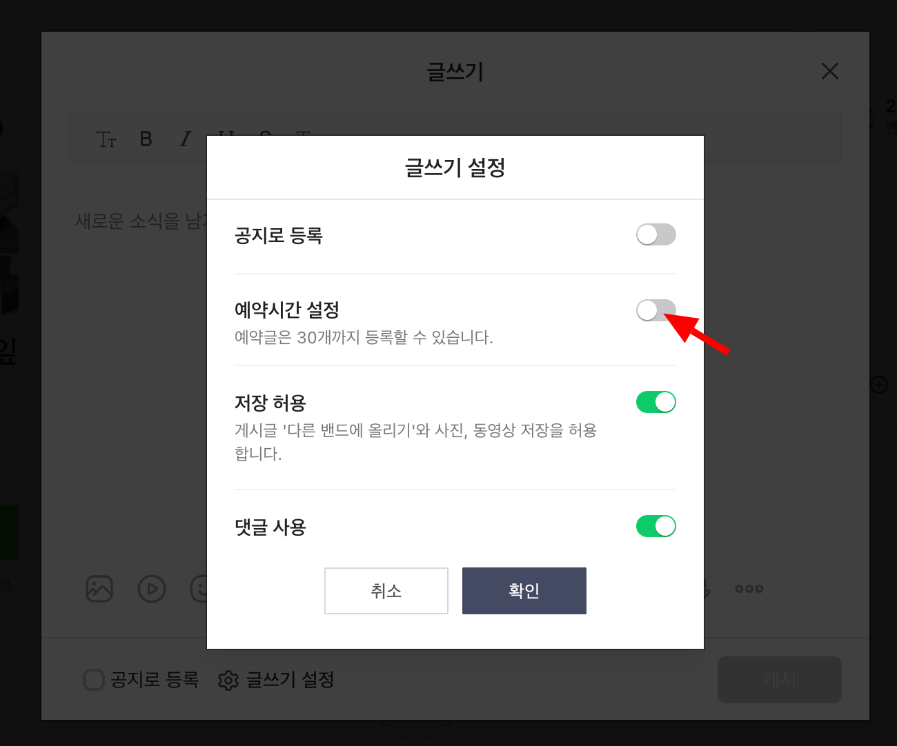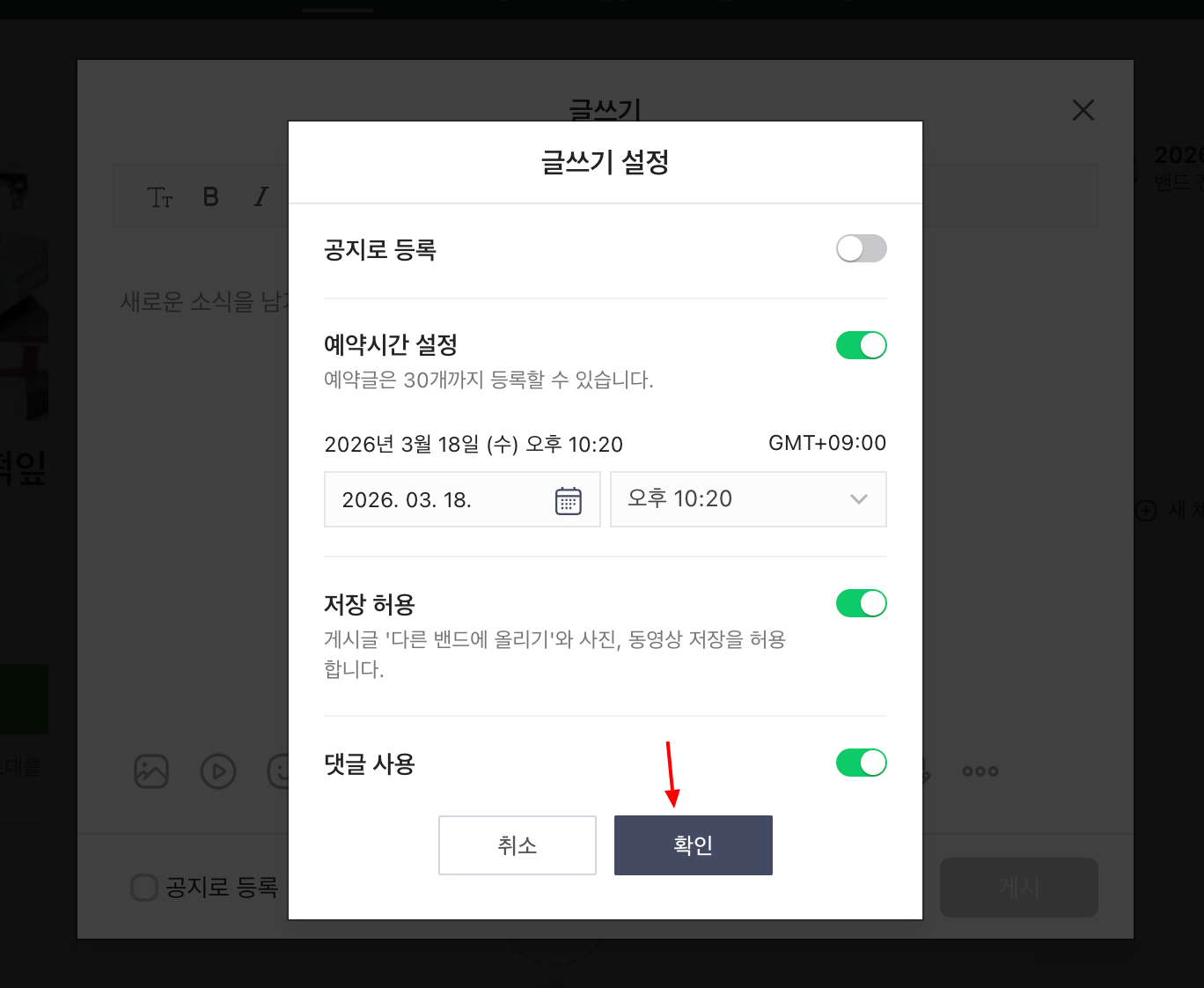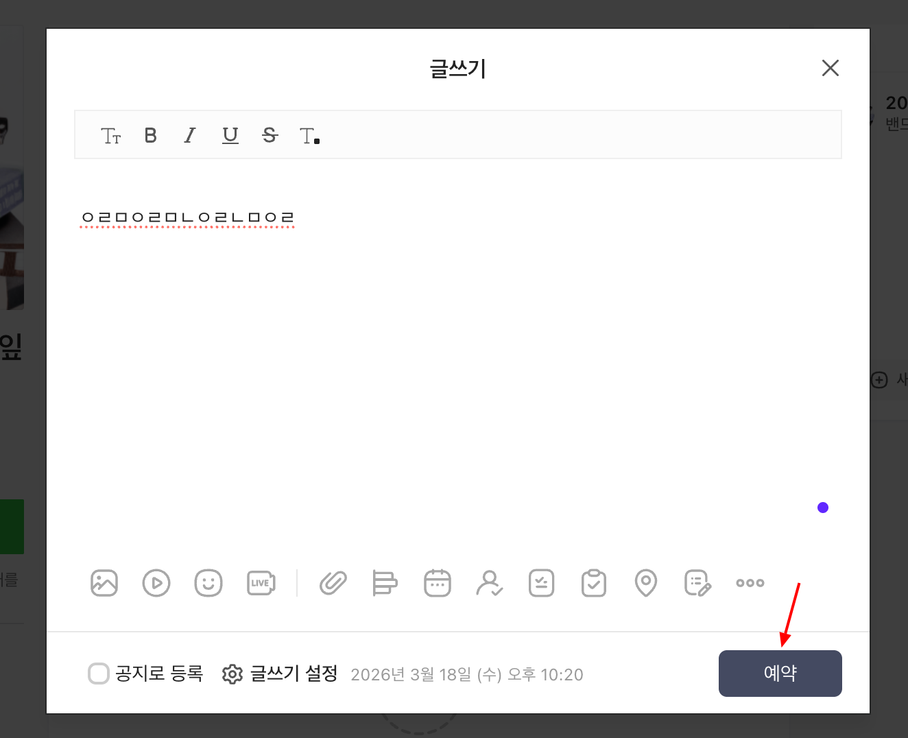 5. 글쓰기 화면으로 돌아와서 최종 내용을 확인하고 맨 아래 예약을 누르면 끝!