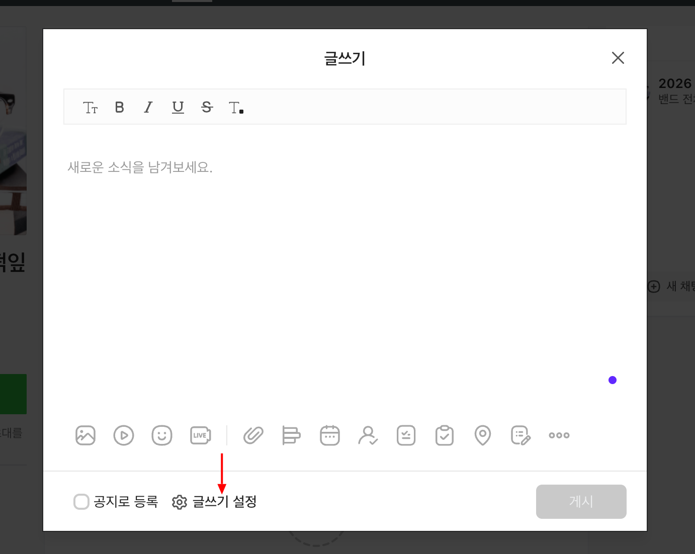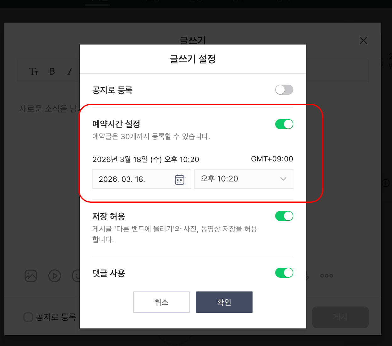 카톡에도 예약 글쓰기 기능이 있지만 오픈 채팅방에는 그런 기능이 없기 때문에 밴드를 이용하면