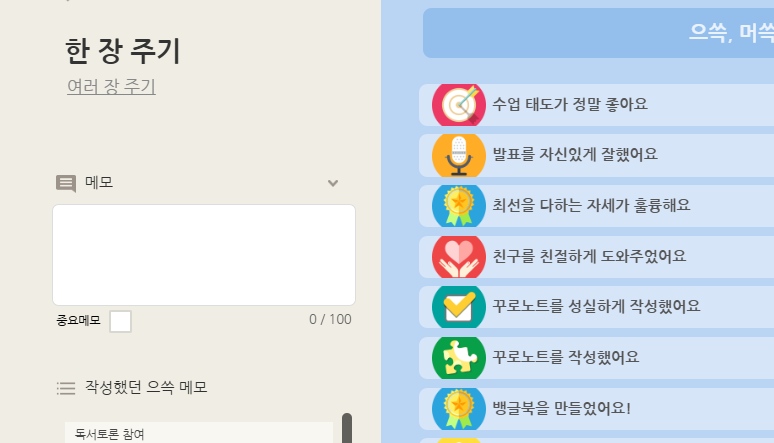 Class123에서는 으쓱카드를 주고 나서 추가로 메모할 수 있습니다. 그런데 Classdojo는 메모 기능이 없는 것 같다。하지만 dojo도 메모 기능이 있다。 어떻게 사용하는지 알아보자。 학생을 선택하고 보상을 준다.그러면 위에 메모 추가가 있다.🖊️메모 추가를 누르고 관련 내용을 입력한다. 그리고 나면 메모가 어디에 저장되었는지 모른다.당황하지 말고 오른쪽 메뉴 중에 [옵션]을 선택한다. 그리고 [보고서 보기]를 눌러보자.학생을 선택하면 오른쪽에 보고서가 보인다.그 밑에 추가한 메모를 확인할 수 있다. 스프레드 보기로로 다운 받을 수도 있고, 바로 출력할 수도 있다.그럼 이제 Class123은 아니지만 Classdojo로 비슷하게 활용할 수 있겠다.